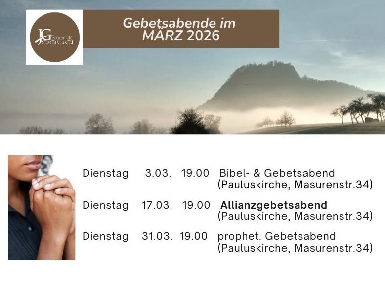 Dienstag 31.03. 2026 um 19.00 Uhr als Prophetischer Gebetsabend (Pauluskirche, Masurenstr.34).